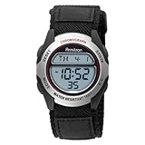 With trendy silver and black styling and useful chronograph functions, the Armitron Men's Chronograph Black Strap Digital Sport Watch is the ideal timepiece for the active man. Encircled by a durable, silver-tone case with black resin outer ring, the large digital window displays the time in easy-to-read numbers, while the day and date are tracked by a smaller rectangular display at the top of the dial. With useful alarm, lap time, military time, countdown timer, and stopwatch functions as well as the option for a second time zone, this streamlined watch is ideal for travelers, athletes, or business professionals. With a convenient EL backlight, this timepiece is great for easy night or day viewing. This sport watch secures to the wrist with a flexible, black nylon strap with Velcro clasp. The Armitron Men's Sport Watch is water resistant to 165 feet (50 meters).
