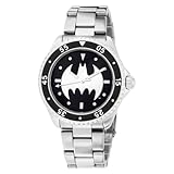 Bat-time is easy to read with this fun watch. Featuring white spear-shaped and round indexes and analog-quartz-powered three-hand movement on a black face, this fun 42-millimeter-diameter stainless steel watch will help you keep Gotham City safe and secure. The only decoration is a big white bat shape--just like what you see projected in the sky of Gotham City every time an evil arch-villain attacks. The stationary black bezel encircling the dial of this Armitron watch is ringed with silver Arabic-numeral seconds markers from 05 to 55 in 10-second increments so you can check Batman's response time to the next attack. The stainless steel link band is 20 millimeters wide, closes with a deployment buckle, and is long enough to fit around adult or child Batman fans' wrists.