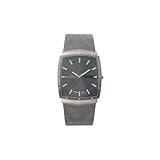 Add an edgy accent to your contemporary couture with the silvery gray Skagen titanium men's watch, which features a sophisticated design and Skagen's signature, ultra-thin stainless steel and titanium mesh band. The case is made from solid titanium, which is nearly 50 percent lighter than steel, but 30 percent stronger. It's also particularly resistant to salt water corrosion, as well as hypo-allergenic--perfect for those with metal allergies. Measuring 31.5mm (1.25 inches) wide, this square case is just 6mm (0.25 inches) thick and it's topped by a bezel with tiny machine bolt accents. It has a dark gunmetal gray dial that's complemented by silver stick dial markers, dotted small minute indexes, silver baton hands, and a day-and-date function at 3 o'clock. Other features include a super-hardened, scratch-resistant mineral crystal and precise Japanese quartz movement.