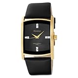 Shimmering crystals and sleek gold-tone accents define the Armitron Men's Swarovski Crystal Accented Gold-Tone Black Leather Strap Watch. With a thick, black edge framing the rectangular, black dial, this stylish timepiece features an elegant, gold-tone stainless steel case that extends to secure the smooth, black leather band with matching gold-tone buckle clasp. The elongated dial offers a streamlined design with stunning, double-set crystals at three, six, nine, and 12 o'clock. Gold-tone hour and minute hands and a sweep second hand track the time, and this fashionable timepiece is water resistant to 165 feet (50 meters). Relying on precision Japanese quartz movement, this classy watch is dependable and adds a level of sophistication to the modern man's wardrobe.
