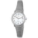 A stainless steel expansion bracelet and stainless steel bezel make the Timex women's EZ Reader expansion watch suitable for any occasion. Featuring a white dial, with black Arabic numerals, a date display at 3 o'clock, and an Indiglo night light, the EZ Reader offers both style and convenience. It is powered by precise analog-quartz movement and protected by a mineral dial window. This timepiece is also water resistant to a depth of 99 feet.