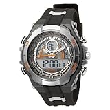 The Armitron Men's Analog-Digital Multi-Function Gray and Black Sport Watch features an alarm, chronograph subdials, dual time zone, and countdown features to give you that competitive edge. Constructed with a lightweight resin case, the watch includes a stationary metal bezel with easy-to-read button markers, and a gray resin wristband secured with a buckle clasp. A durable mineral window shields the digital-gray dial, which features the digital time along with the day and date. The dial is framed by gray arrow hour markers and slim orange minute indexes, and includes luminous watch hands for a traditional time display. Four function buttons frame the face and access the alarm, light, lap, dual time zone, countdown and military time functions. Powered by Japanese-quartz movement, the watch is water resistant to 330 feet (100 M).