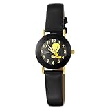 Tweety Bird, cute as always, also looks elegant on this all-black and gold-tone watch by Armitron. Its round, 24-millimeter, gold-tone metal case supports a wide, round, black bezel, which encloses a jet black dial behind a mineral window. On the dial, Tweety seems to be looking out warily for a putty tat while the analog-quartz-powered, gold-tone hours, minutes, and seconds hands and the gold-tone Arabic-numeral indexes take care of business. The 12-millimeter black leather band closes with a gold-tone buckle, which completes the elegant simplicity of this watch's design. Don't tell Tweety, but you're going to look like a sleek, elegant--yet fun-loving--feline yourself with this on your wrist. Wear it with jeans or for casual business occasions when you don't mind showing your whimsical side.