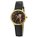 Featuring a flirty cartoon image of Betty Boop on a black dial, this Women's Analog Watch from Armitron is fun, functional, and fashionable. Offering a sleek, leather band with buckle clasp, gold-tone metal bezel and case, three slim, gold-tone hands, and Arabic numeral indices, this timepiece adds a touch of Betty's colorful sex appeal to your everyday wardrobe. A durable mineral window protects the unique face. This watch is powered by reliable analog-quartz movement.