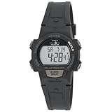 The Timex Midsize/Unisex Ironman Basic 10 Lap Digital Watch allows beginning triathletes to train with a worthy timepiece. The watch is constructed with a durable resin case, a stationary black resin bezel, and a strong, black resin wristband with a secure buckle clasp. A durable mineral window shields the digital-gray dial face, which displays the time as well as the day, date, and month. Four buttons decorate the bezel in gray and white--mode, stop/reset, Indiglo, and set/recall--while a prominent gray start/split button rests below the six o'clock position and tracks up to 10 laps. This athletic timepiece is powered by digital-quartz movement and is water resistant to 330 feet.
