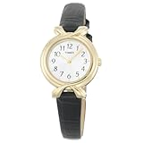 The Timex Women's Classic Black Leather Strap Watch features a sleek brass bow-tie bezel that lends the timepiece a sophisticated casual appearance. The timepiece is also designed with a strong brass case and a comfortable black leather wristband with an adjustable buckle clasp. A durable mineral window shields the crisp white dial face, which features black Arabic numeral hour indexes, gold dot hour markers, and complementary gold-tone watch hands. This timepiece is powered by analog-quartz movement.