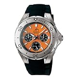 The fiery orange dial face found on the Casio Men's Reverse Bezel Sport Dive Watch will help you see in even the darkest of waters. This diving watch is constructed with a stainless steel case, a unidirectional stainless steel bezel, and a strong black resin wristband with an adjustable buckle clasp for a unique fit. A durable mineral window shields the orange dial face, which features white-dash hour indexes and three black chronograph subdials including day-and-date displays. This analog-quartz-powered timepiece is water resistant to 660 feet and comes with a one-year limited manufacturer's warranty.