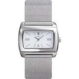 Elegantly chic, the Timex T2F701 stainless steel women's watch is the perfect complement to a night out at the opera or on the dancefloor. It features a wide, rectangular watch case in polished silver stainless steel with rounded corners. It frames a white dial background with thin stick dial markers, small minute indexes, Roman numerals at the quarter-hour marks, and tiny stick hands (with seconds hand). It's finished by an elegant mesh metal band. This watch has an estimated battery life of two years.