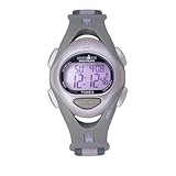 Timex gives its signature Ironman Triathlon multi-function, performance sport watch a sleek new look that's a great fit for both men and women and a deep purple Indiglo night-light. Featuring a full complement of athletic timing features and a striking profile, the Timex T5G301 digital watch has a lavender and silver top ring, lavender and light gray nylon strap, and an all-day white reflector display for easy readability. It features three alarms that can be set for daily/weekday/weekend/weekly alarms, two time zones, and water resistance to 100 meters (330 feet). Sport timing functions include: