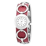 Unique and distinctively chic, the Pedre Women's Silver-Tone with Fuchsia Horse Bit Bangle Watch features a stainless steel case back and distinctive leather horse bit bangle bracelet that closes with a bangle bracelet clasp. A formidable fashion accessory, this timepiece also features an attractive round dial with Arabic hour markers and silver-tone hands. Other features include reliable Japanese quartz movement and a scratch-resistant mineral crystal. It also comes in formal gift packaging, making this watch an ideal timepiece for gift giving.