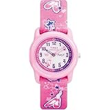 The popular Timex kid's Time Teacher Pink Ballerina watch continues to be one of the most kid-friendly watches around. Its durable design gives this watch the capability to withstand rough wear, and its innovative features cater to your daughter's creativity. Easy-to-read Arabic numerals and stylized ballerina slippers embellish the classic white dial face, and the case is glossy pink. A steadfast buckle clasp accompanies the charming elastic-fabric band, which features an array of slippers and stars. The watch, which is powered by analog-quartz movement, also features an Indiglo night light. Learning to tell time has never been so much fun. This watch, which is water resistant up to 99 feet, is backed by a 1-year manufacturer's warranty.