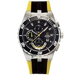 Engineered with features and functions that meet the demands of professional explorers, adventurers and world travelers, this high performance National Geographic Pioneer Series Deep Blue men's stainless steel chronograph watch is rugged enough to handle your adventures yet stylish enough for everyday casual wear. It features a large, silver-tone stainless steel case that measures 46mm (1.81 inches). It's topped by a black unidirectional rotating bezel with elapsed time markings, glow-in-the-dark zero mark, and coin-edged detailing for a firm grip under any condition. The black dial includes luminous dagger-shaped hands (with seconds hand), luminous hour markers, three chrono subdials, and a date window at 4 o'clock. It's completed by a polyurethane diving strap in black with yellow accents. Other features include a Japanese-made quartz movement, scratch-resistant mineral crystal, and water resistance to 200 meters (660 feet)--enabling it to stand up to the rigors of recreational scuba diving.