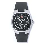 Stainless Steel Case Screw in case back, Screw down crown, Date display at 3 O'clock, Black Synthetic Strap