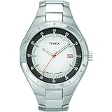 Coolly contemporary in style, the full-sized Timex T2G631 stainless steel watch is a great choice for both men and women, and it features Timex's vaunted Indiglo night-light in vibrant orange. The large, round silver stainless steel watch case frames a silvery white dial background with thin stick markers, stick hands (with seconds hand), and a date display at 3 o'clock. With the Quick Date function, you can set the date on the watch without turning the crown for every 24-hour period. Just pull the stem halfway out, and turn until desired date is reached. It also offers water resistance to 100 meters (330 feet) and an adjustable stainless steel link bracelet band with deployment buckle.