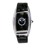 Pierre Cardin's watch for women is elegantly designed and features a rectangular, stainless steel case with a bejeweled bezel, a black dial that subtly showcases the silver Roman numeral indices at 12 and 6 o'clock and sleek, crocodile-textured, black leather bands. This exquisite timepiece is water resistant to 99 feet.