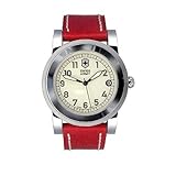 From the maker of the genuine Swiss Army Knife comes this suitably durable and stylishly refined Cavalier stainless steel men's watch. Featuring precise Swiss-manufactured quartz movement, this large, round watch has a wide, flattened bezel framing the ivory face. The dial includes a full Arabic numeral display, luminous sword-shaped hands (with seconds hand), small minute indexes, and a round date window at 3 o'clock. It's matched to a fine grain leather strap in red with white stitching and a stainless steel buckle with an engraved Swiss Army shield. Other features include a scratch-resistant sapphire crystal, large, easily operated crown, and water resistance to 50 meters--suitable for swimming but not for diving.