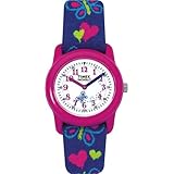The Timex T89001 Youth watch is reliable, durable, and readable in the dark, thanks to the integrated Indiglo night-light, but it's also flat-out fun to wear. This quartz analog watch features an easily readable, full Arabic numeral display and smaller 5-minute notations on the outside of the dial. It also has a small butterfly that rotates around the dial with the hands, and a comfortable elastic fabric strap (for better dirt and stain resistance) with butterflies and hearts against a blue base. This watch also offers water resistance to 30 meters (99 feet), durable pinkish red resin case, different colored hour and minute hands, and Timex's unique Kids Loss Protection Plan. It's recommended for children ages 6 and older.