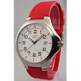 Stainless Steel Case Easy to read black numbers, Second sweep hand, Swiss army logo at 12 O'clock, Date display at 3 O'clock, Red Synthetic Strap